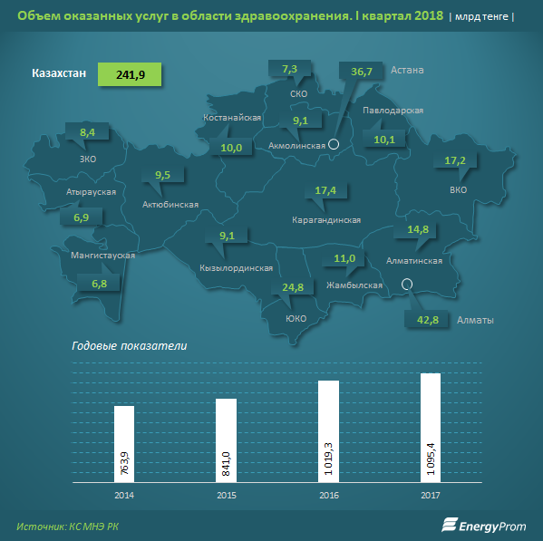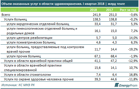 За первый квартал текущего года в сфере здравоохранения было оказано услуг на 241,9 миллиарда тенге - это на 3,6 процента меньше, чем годом ранее. В то же время при общем спаде по Казахстану в обеих столицах отмечен прирост: в Алматы - на 1,8 процента за год, до 42,8 миллиарда тенге (это уже 17,7 процента от РК против 16,8 процента годом ранее), в Астане - на 2,4 процента за год, до 36,7 миллиарда тенге (15,2 процента от РК против 14,3 процента год назад).