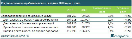 Несмотря на заметное удорожание медуслуг, зарплаты в сфере здравоохранения и соцуслуг по итогам первого квартала текущего года достигли всего 101,8 тысячи тенге - это лишь на 2,1 процента больше, чем годом ранее, а с учетом инфляции покупательская способность заработных плат сократилась год-к-году на 4,2 процента.