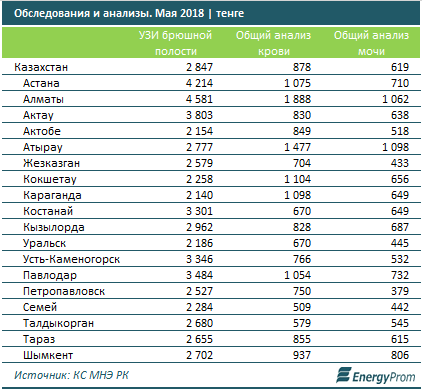 УЗИ брюшной полости по итогам мая стоило в среднем по РК уже 2,8 тысячи тенге, на 6,2 процента больше, чем год назад.