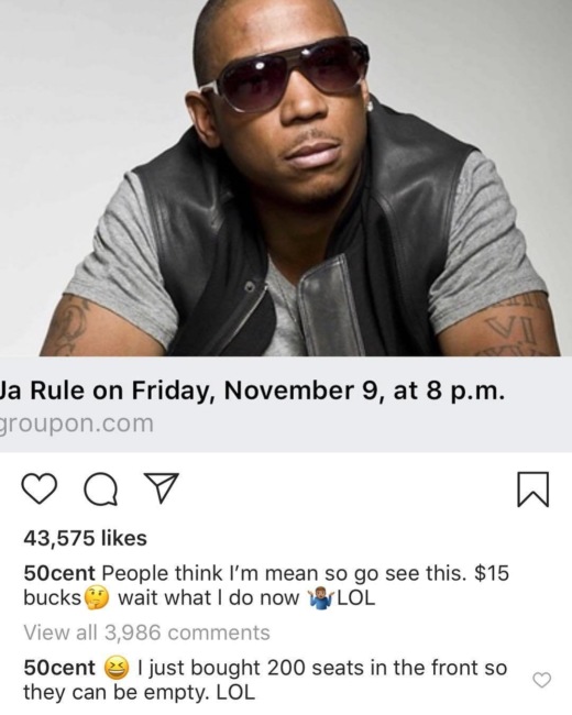 На своей странице в Instagram 50 Cent опубликовал коллаж с "пустыми местами" на концерте Ja Rule и шуточное видео на ту же тему.