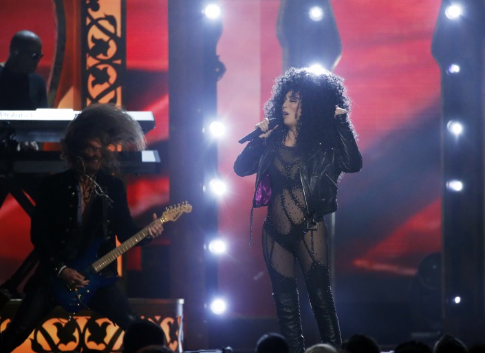 Для второй песни Шер надела черную кожаную куртку поверх прозрачного черного трико.