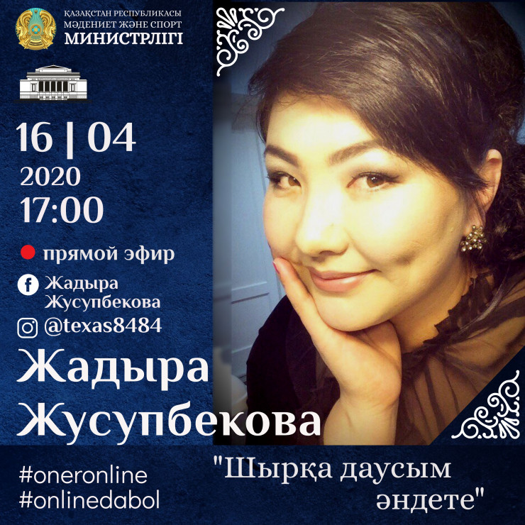 Сегодня, 16 апреля, в 17.00 зрителей ждет Home Online Concert солистки ГАТОБ имени Абая - Жадыры Жусупбековой. В программе прозвучат песни Абая Кунанбаева, Шамши Калдаякова и Латыфа Хамиди. Этот концерт будет не только теплой встречей со слушателями, но и данью памяти великому педагогу - Сауле Курмангалиевой. Mузыкальная встречa пройдет на странице Facebook Жадыры Жусупбековой и в аккаунте Instagram: texas8484.
