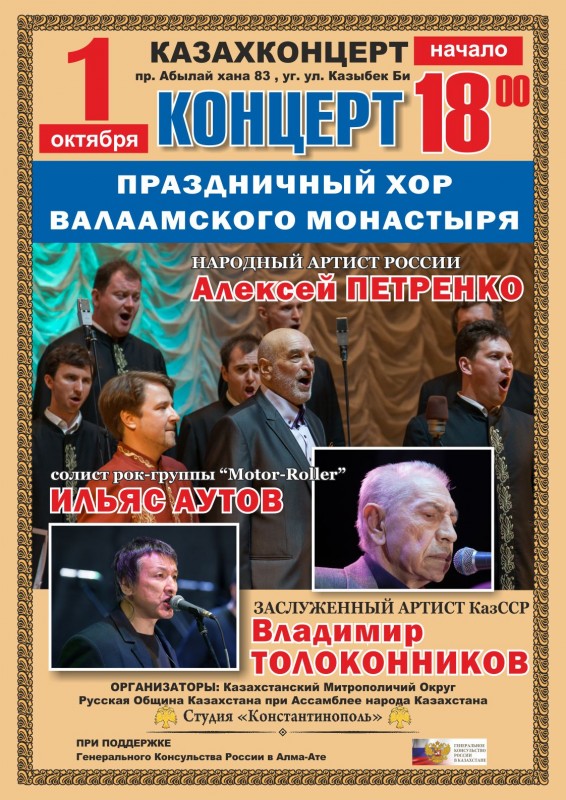 Кроме того, 30 сентября Праздничный хор Валаамского монастыря даст концерт в Казахской государственной филармонии имени Жамбыла (улица Калдаякова, 35, угол улицы Толе би). Начало в 19.00.