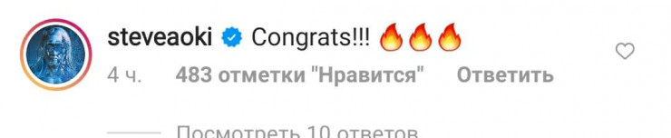 Американский диджей и музыкальный продюсер Стив Аоки поздравил музыканта, прокомментировав его публикацию в Instagram.