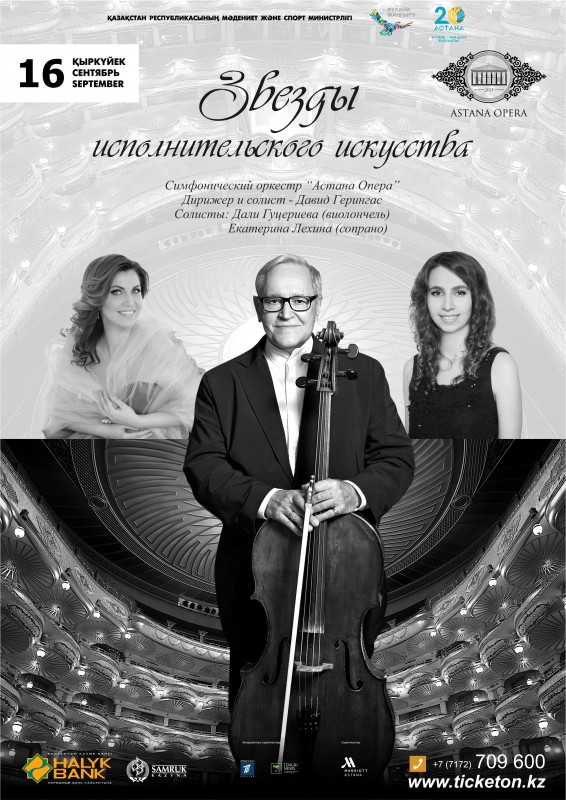 Их имена широко известны во всем мире: виолончелист и дирижер, лауреат первой премии (золотая медаль) Международного конкурса имени Чайковского Давид Герингас; лауреат первой премии Международного конкурса имени Кнушевицкого Дали Гуцериева (виолончель) и лауреат первой премии Международного конкурса вокалистов Пласидо Доминго "Опералия" Екатерина Лехина (сопрано). Программа концерта "Звезды исполнительского искусства" также пройдет в блистательном исполнении симфонического оркестра "Астана Опера".