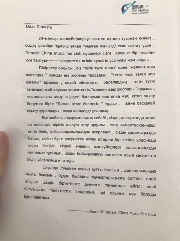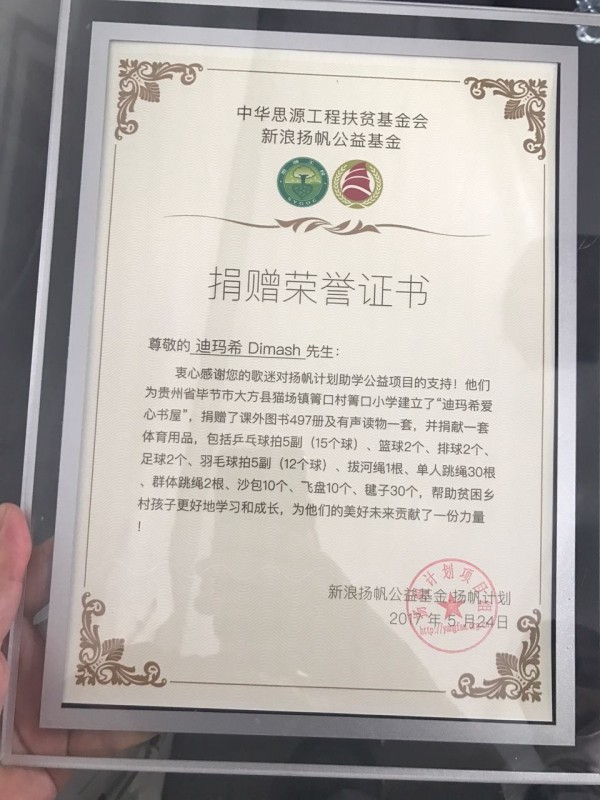Фанаты вручили Димашу почетную грамоту "Социальное удостоверение доброты".