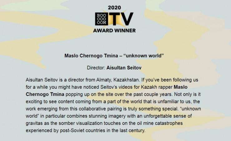 Клип казахстанского режиссера Айсултана Сеитова на песню рэпера масло черного тмина (творческий псевдоним казахстанского музыканта Айдына Нуралина) завоевал награду BooooooomTV Awards 2020 в номинации "Лучшее музыкальное видео года", передает Tengrinews.kz.