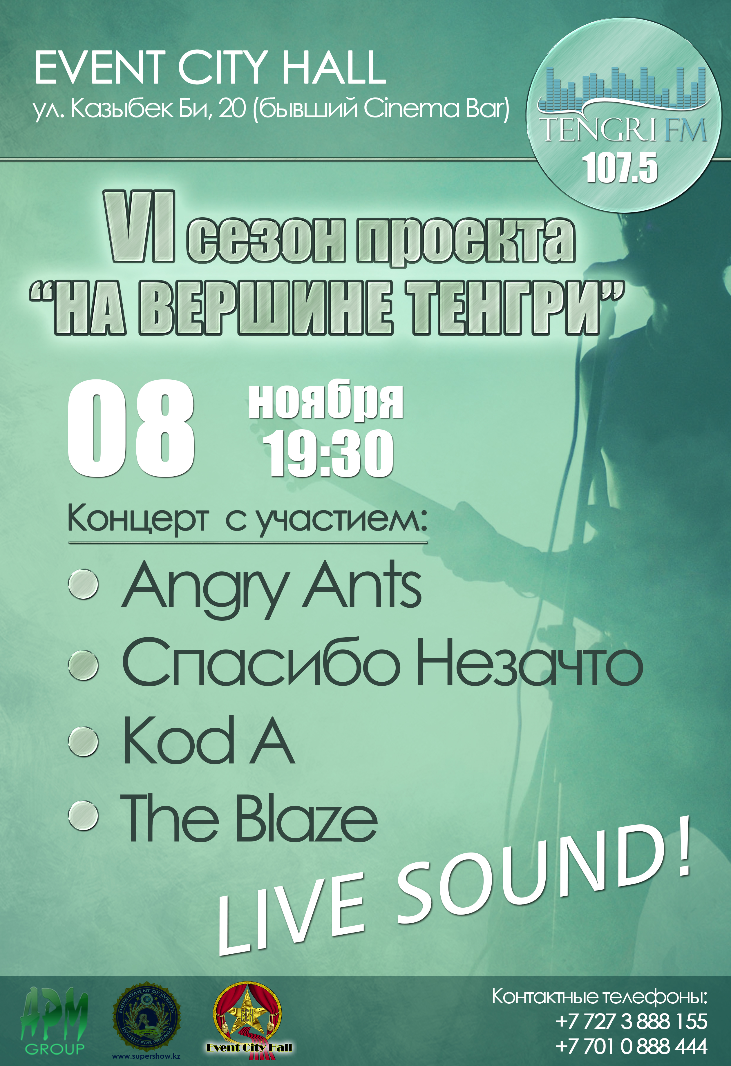 На втором концерте ноябрьской сессии проекта "На вершине Тенгри" за место в полуфинале поборются четыре группы, сообщает корреспондент Tengrinews.kz. 8 ноября на сцене Event City Hall (бывший Cinemabar) выступят коллективы Angry Ants, The Blaze, Kod A и "Спасибо Незачто".