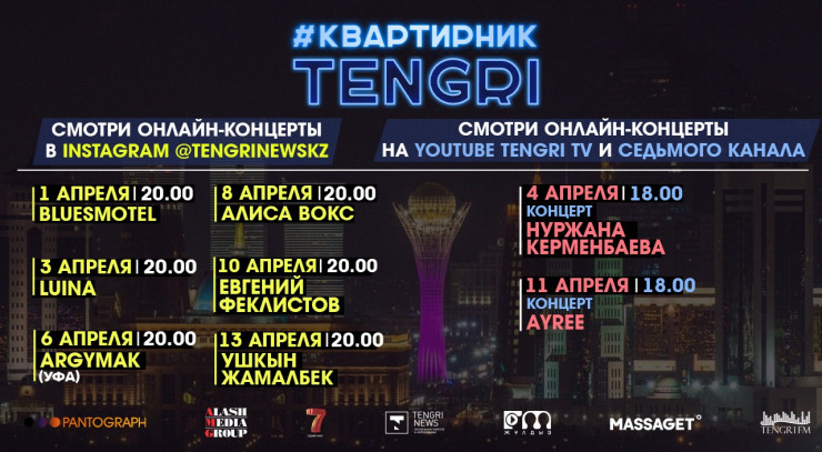 #КвартирникTengri акцентирует внимание на важности социального дистанцирования и соблюдения необходимых мер защиты в борьбе с COVID-19. Ранее в рамках проекта выступили группа Urker, лидер казахстанской рок-группы Motor-Roller Ильяс Аутов, певец Son Pascal и Indie rock группа BluesMotel.