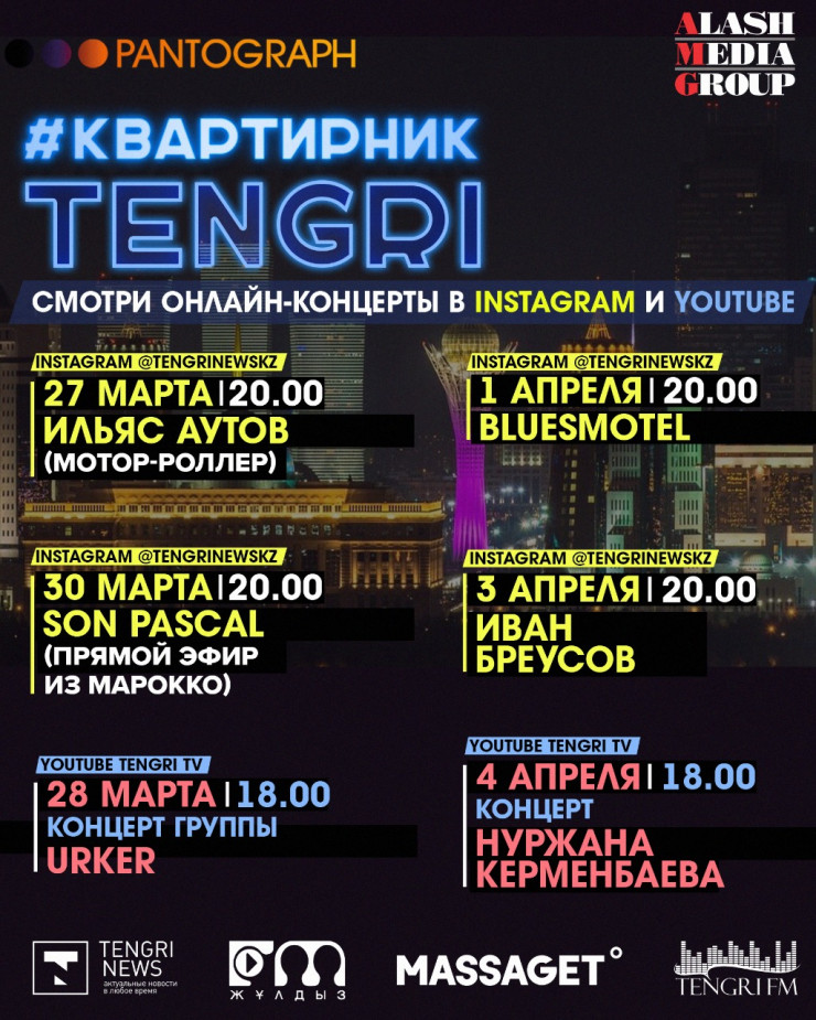 Напомним, медиахолдинг Alash Media Group совместно с продюсерским центром Pantograph запускает серию онлайн-концертов #КвартирникTengri. Первый Insta-Live состоится уже сегодня, 27 марта, в 20.00 с лидером казахстанской рок-группы Motor-Roller Ильясом Аутовым.