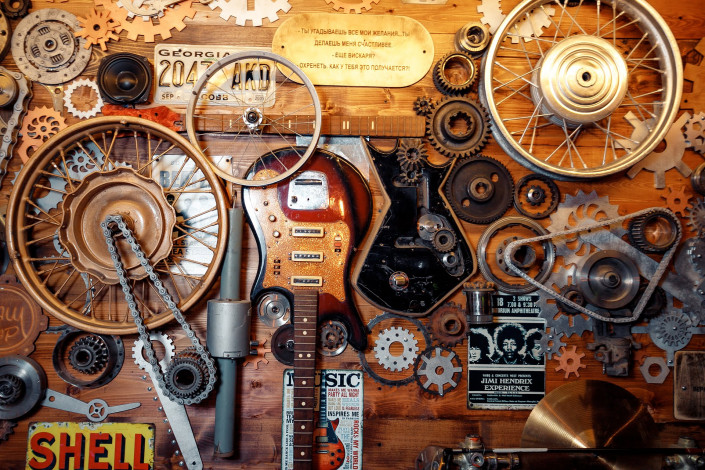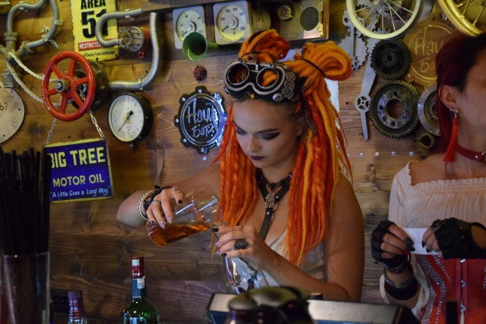 Чего только стоят наряды официантов и меню в стиле стимпанк! А стены, украшенные под мотомастерскую? А барабаны от стиральных машинок в качестве элемента дизайна? А Мэрилин Мэнсон, косящий на тебя глазом в туалетной кабинке? Да отсюда без пары десятков селфи точно не уйдешь!