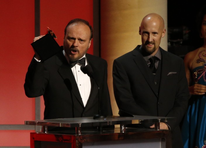 Джеймс Гатри и Джоэль Плант принимают награду за "Лучший альбом с объемным звучанием"