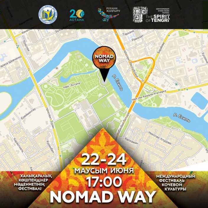 Местом проведения Nomad Way 2018 выбран амфитеатр на набережной реки Есиль. Добраться до амфитеатра можно на маршрутах № 18, 28, 32, 37, 44, 52 и 127. Ближайшая к месту проведения остановка - Салтанат Сарайы. В этом году астанчан и гостей столицы ждут три незабываемых концертных дня (22-24 июня). На сцену фестиваля выйдут 19 уникальных коллективов из 20 стран мира, представляющих музыкальную культуру тюркских и братских народов. Начало концертов в 17.00. Вход свободный.
