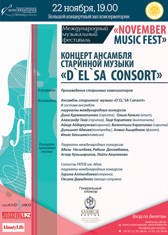 В рамках November Music Fest выступят солисты и коллективы консерватории, ансамбль старинной музыки D’EL’SA Consort, дирижер Дориан Уилсон (США), трубач Марко Пьеробон (Италия), пианистка Ботагоз Айгалкаева, скрипач Ержан Кулибаев, юный пианист Санжарали Копбаев, солисты ГАТОБ имени Абая Зарина Алтынбаева (сопрано), Оксана Давыденко (меццо-сопрано).