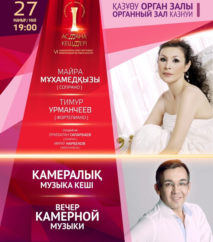 27 мая на вечере камерно-вокальной музыки в органном зале КазНУИ своими выступлениями порадует ведущая солистка столичной оперы Майра Мухаммедкызы. Также зрители смогут насладиться выступлением заслуженного деятеля РК Тимура Урманчеева на фортепиано и других музыкантов. По словам Майры Мухаммедкызы, она впервые принимает участие в данном фестивале.