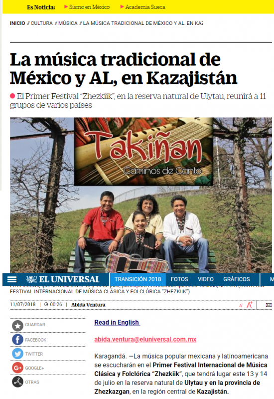 Крупнейшие мексиканские газеты ElUniversal и La vozdeMichoacan, международный журнал об оперном искусстве NewMerker, выпускающийся в Австрии, интернет-портал Peruanosensuiza и другие издания из разных стран рассказали своим читателям о фестивале этнической музыки "Жезкиiк", прошедшем в июле в Улытау Карагандинской области.