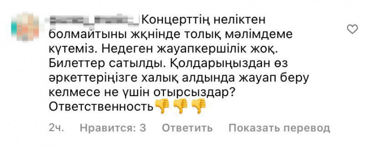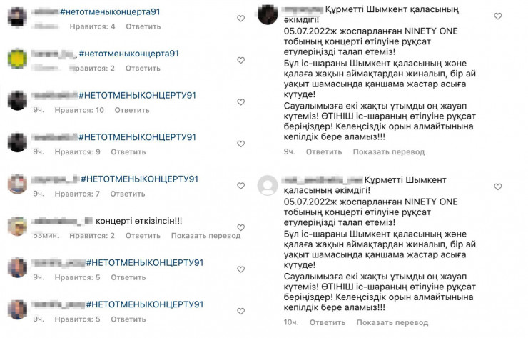 Фанаты группы буквально "штурмовали" страницу акимата и акима Шымкента в Instagram. Поклонники даже придумали специальный хештег, который писали под постами, - #нетотменыконцерта91.