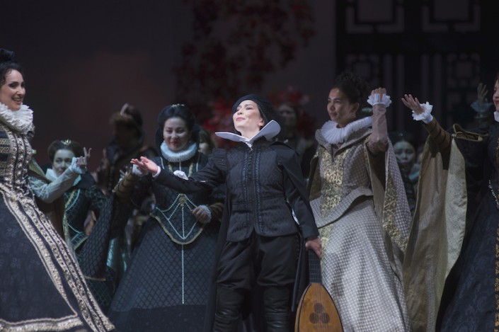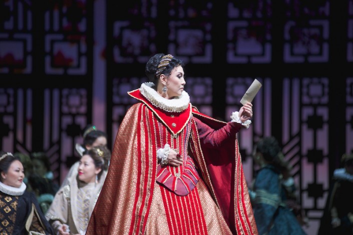 Говорить о вокальных лидерах в "Доне Карлосе" можно долго. Уверенное звуковедение и хорошая подача текста ведущих артистов заслуживают отдельных аплодисментов. В сложнейшей партии Елизаветы Валуа на сцене блистала Жаннат Бактай. Сопрано вызвала большую симпатию у зала. Певица демонстрировала музыкальную выразительность, яркие низы и верха, богатые филировки и пиано. Видно было, что все движения артистки отточены, по-королевски величавы, но в то же время мягки и женственны.