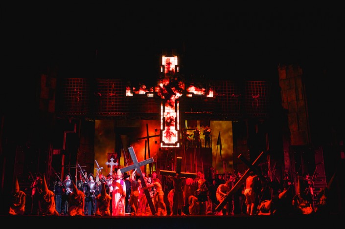 Несмотря на то, что действие показывает исторический период, все же окаменелой классикой назвать спектакль сложно. Современные технические возможности театра позволили сделать его по-современному подвижным, а игра цвета (серебро, черный, красный) напоминала актуальную сегодня dark fantasy. Пылающий пламенем крест, спускающийся из-под театральных сводов, фигура Карла V, застывшая в камне, парящие в воздухе клетки с заключенными в них людьми - все это не могло не поражать воображение. Безусловно, одной из самой ярких сцен стала сцена сожжения еретиков - этот ритуал до мурашек пронизывал своей правдоподобностью, страдания людей были максимально на виду.