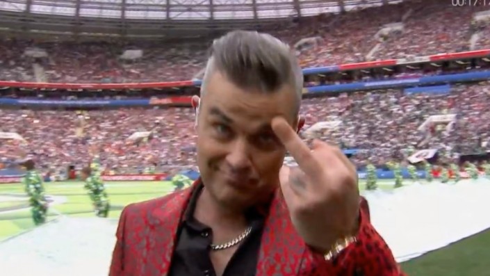 Британский певец Робби Уильямс во время своего выступления на церемонии открытия чемпионата мира по футболу в Москве показал средний палец в камеру. Эпизод попал в телетрансляцию на российских федеральных каналах. Об этом сообщает "Чемпионат".