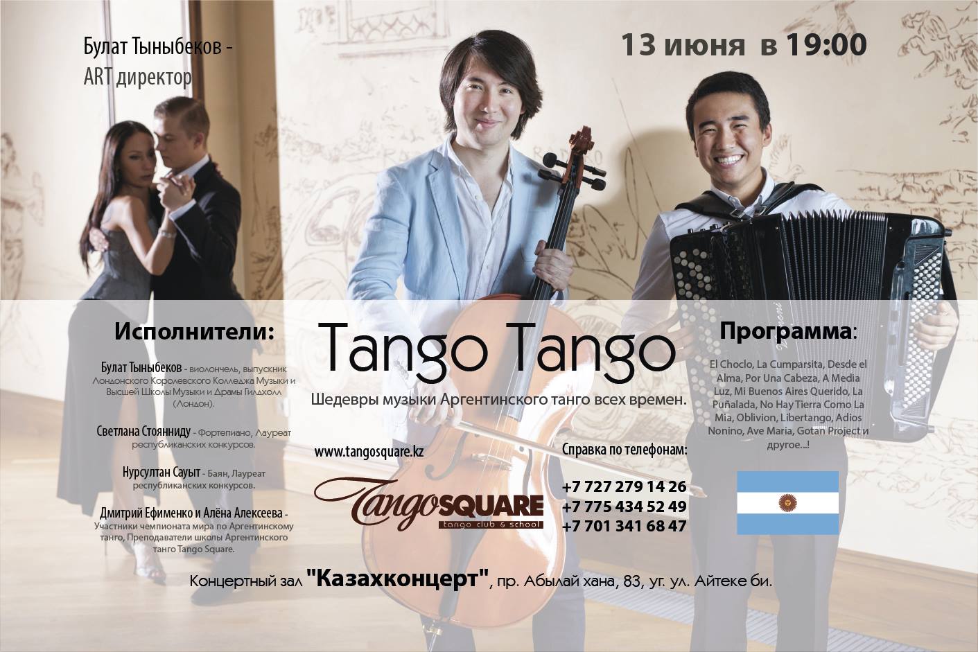 Солировать будут выпускник Королевского колледжа музыки и высшей школы музыки и драмы Гилдхолл Булат Тыныбеков (виолончель), лауреат республиканских конкурсов Светлана Стоянниду (фортепиано) и Нурсултан Сауыт (баян). В программе концерта прозвучат известные композиции, такие как El Choclo, La Cumparsita, Desde el Alma, Por Una Cabeza, A Media Luz, Mi Buenos Aires Querido, La Puñalada, Ave Maria и Gotan Project.