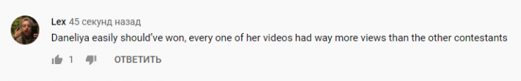 "Данэлия легко должна была выиграть, у каждого ее видео было намного больше просмотров, чем у других конкурсантов"