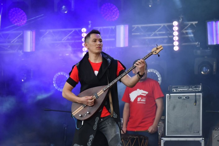 Затем на сцену вышла известная казахстанская этно-рок-группа "Тиграхауд". Музыканты подарили зрителям два варианта исполнения своих композиций: экспериментальная акустика и традиционные этно-рок-вариации.
