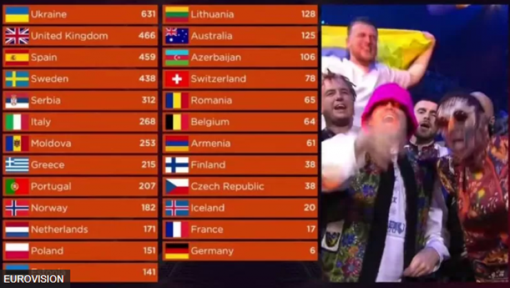 По результатам голосования жюри, Украина заняла четвертую строчку, но сразу после этого были оглашены цифры народного голосования, и Kalush Orchestra с большим отрывом вышла на первое место турнирной таблицы. Зрители дали группе 439 баллов из 480 возможных. В сумме она получила 631 балл.