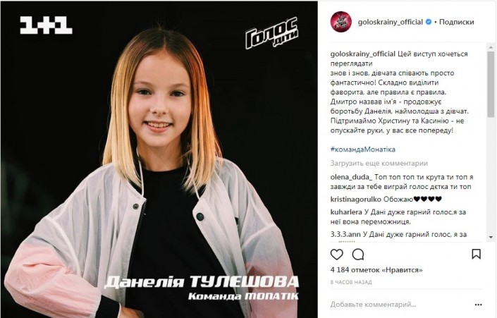 Как сообщается в официальном аккаунте шоу "Голос. Дiти", на данном этапе конкурса Монатик выбрал Данэлию Тулешову.