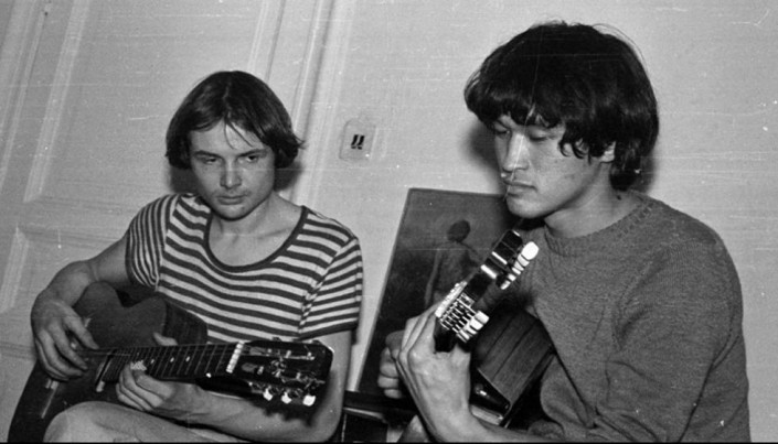 Квартирник. Гитарист, участник первого состава группы "Кино" Алексей Рыбин и Виктор Цой. 1983 год. Фото: Владимир Быстров/Meduza