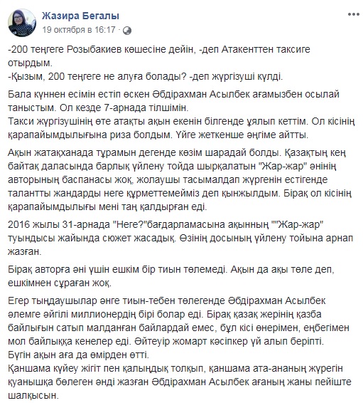 Ақынды таныған адамдардың айтуынша, Абдрахман Асылбек өте қарапайым болған. Бұл туралы журналист Жазира Бегалы Facebook парақшасында жазды.