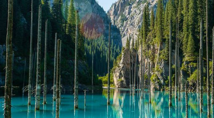 А вот озеро Каинды отличается от других своей удивительной историей возникновения. Образовалось оно в начале XX века. В 1911 году в городе Верном (ныне Алматы) случилось сильнейшее землетрясение. В ущелье Каинды произошел тектонический обвал, а на месте небольшой речки образовалось прекрасное озеро с затопленным хвойным лесом внутри. Под определенным светом водная гладь приобретает очень красивый изумрудный оттенок. Температура воды здесь минусовая, поэтому увидеть таинственный подводный мир можно разве что в специальном гидрокостюме.
