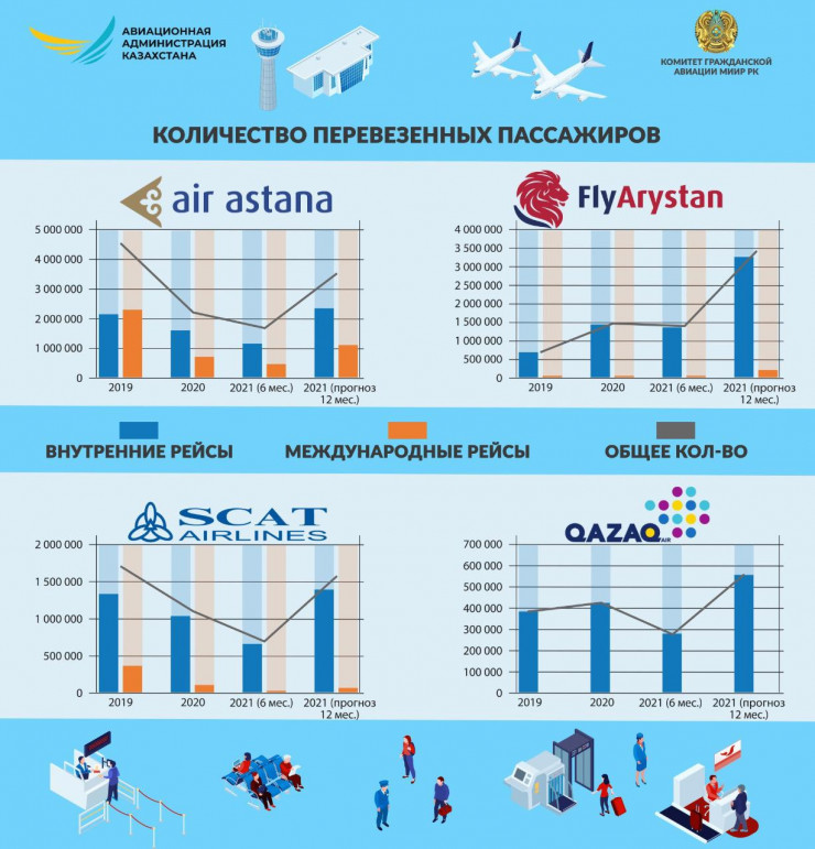 Также в пресс-службе КГА отмечают, что авиакомпания FlyArystan показывает ежегодный рост по числу обслуженных пассажиров (2019 год - 700 233, 2020 год - 1 467 261 и за первое полугодие 2021 года - 1 379 400 пассажиров).