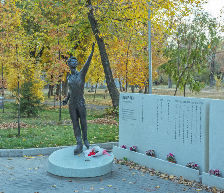 Продолжаем спускаться вниз. Мы снова оказываемся в центре города, богатом на памятники, посвященные и героическим, и трагическим событиям. Ниже пересечения Байсеитовой и Курмангазы находится мемориал погибшему казахстанскому фигуристу, бронзовому призеру Олимпиады-2014 в Сочи Денису Тену. Скульптором является Матвей Макушкин из Санкт-Петербурга. Он также является автором скульптуры Виктора Цоя на улице Тулебаева в Алматы. На гранитном постаменте - строчки стихотворения Дениса и его главные спортивные достижения.