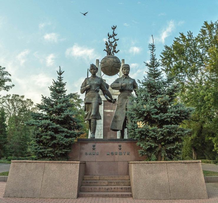 Настало время двигаться дальше. Через дорогу, ниже улицы Богенбай батыра, находится сквер, в котором в 1997 году установлен памятник девушкам - Героям Советского Союза Алие Молдагуловой и Маншук Маметовой. На постаменте изображены две Золотые Звезды Героя Советского Союза и имена девушек на казахском языке: "Әлия" и "Мәншүк". Сюжет памятника является условным, так как Алия и Маншук друг с другом даже не были знакомы.