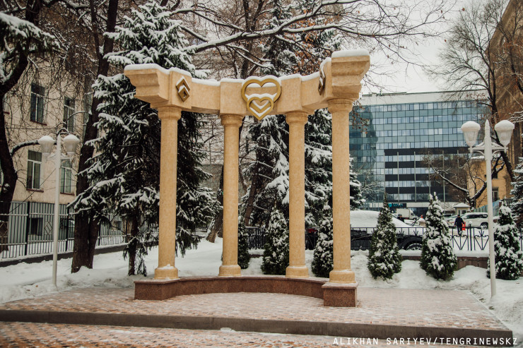Возвращаемся вверх на улицу Толе би. Здесь, в сквере между улицами Желтоксан и Наурызбай батыра, на улице Чайковского (этот отрезок называют Аллеей любви) находится памятник влюбленным. Сейчас он представляет собой четыре колонны, поддерживающие свод со знаком сердца. Памятник был заменен в этом году - ранее на этом месте стояла скульптура сердца, которую влюбленные изрисовали надписями.