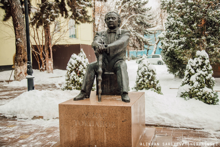 Продолжаем нашу прогулку. Лучше всего добираться до следующего объекта по алматинскому Арбату - улице Панфилова. Не доходя до улицы Богенбай батыра, с левой стороны у вас будет Казахская национальная академия искусств имени Темирбека Жургенова. Здесь можно полюбоваться на два памятника: самому Жургенову и Аскару Токпанову.