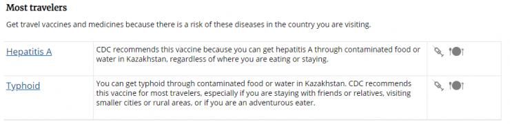 All travelers - прививки, которые по американским нормам нужны всем туристам. Примечательно, что прививочный календарь США намного шире казахстанского: к примеру, в прививочный план для взрослых включена ветрянка.