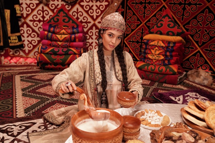 И, наконец, режиссер жестом демонстрирует, что съемки успешно завершены. Наступает момент, которого все так долго ждали. Можно отведать всех лакомств, приготовленных для съемок. Это всеми любимые бешбармак, казы, горячие баурсаки, кумыс, шубат, курт, иримшик и сорпа.