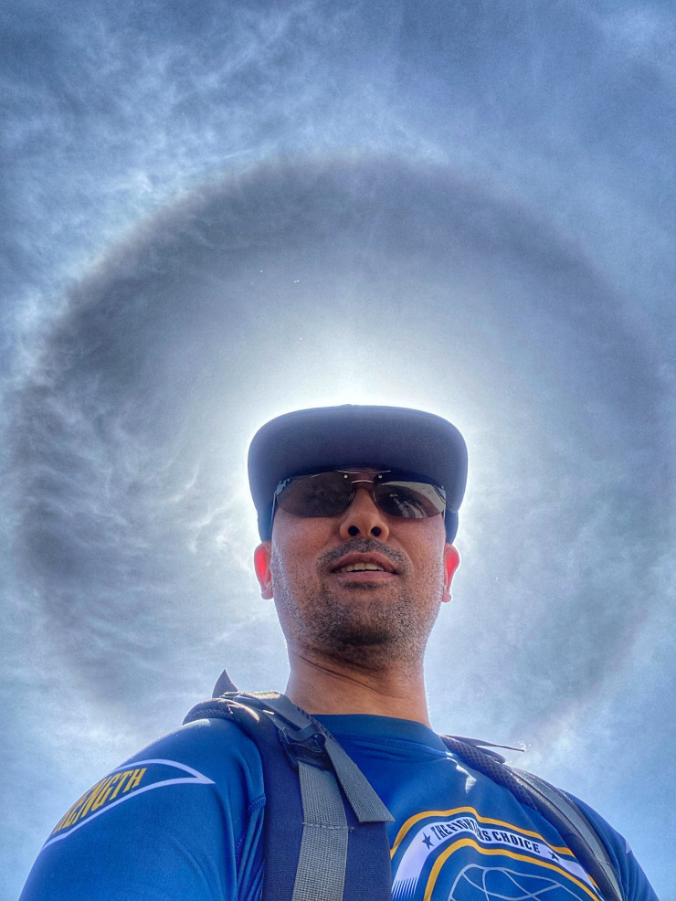 Алматинец Шухрат Имамниязов во время похода в горы стал свидетелем редкого солнечного гало. Ему удалось не только застать солнце в зените, но и сфотографироваться на его фоне, передает Tengritravel.kz.