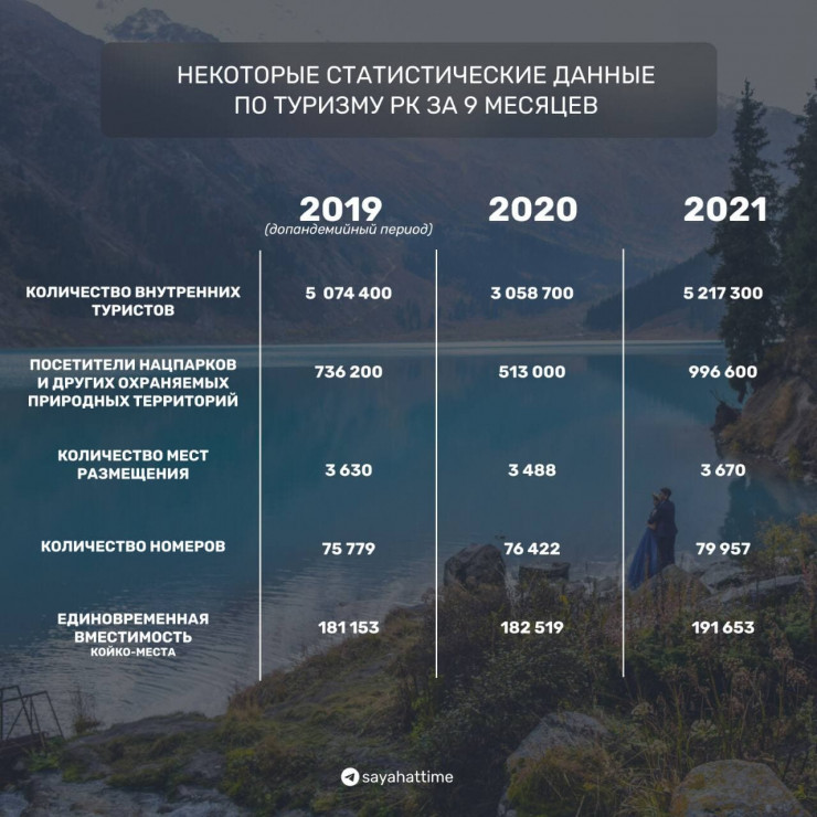 При этом внутренний туризм уже показывает значительный рост. Так, количество обслуженных посетителей-казахстанцев в местах размещения за 9 месяцев 2021 года (4 091 394 человека) уже почти достигло показателей того же периода 2019 года (4 865 790 человек). К слову, в первый год пандемии цифра упала почти в два раза - 2 555 996 человек.