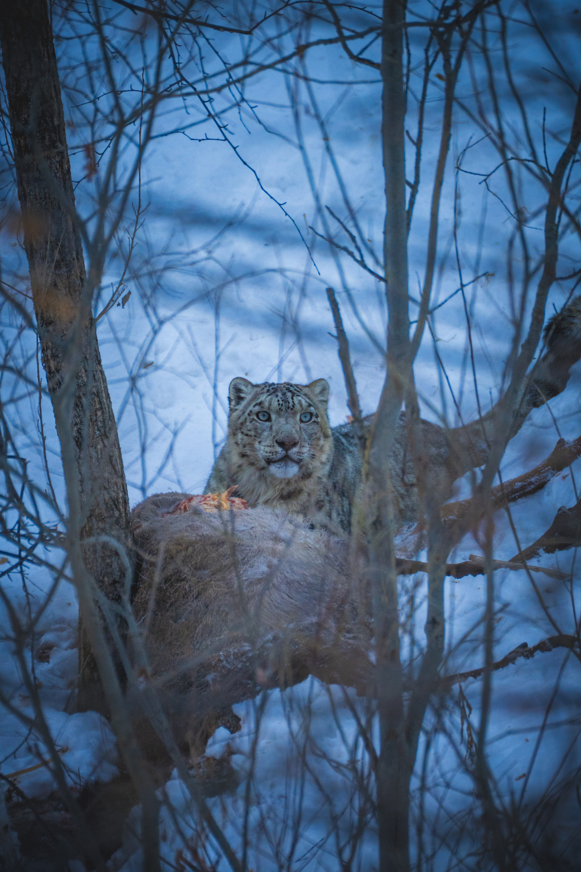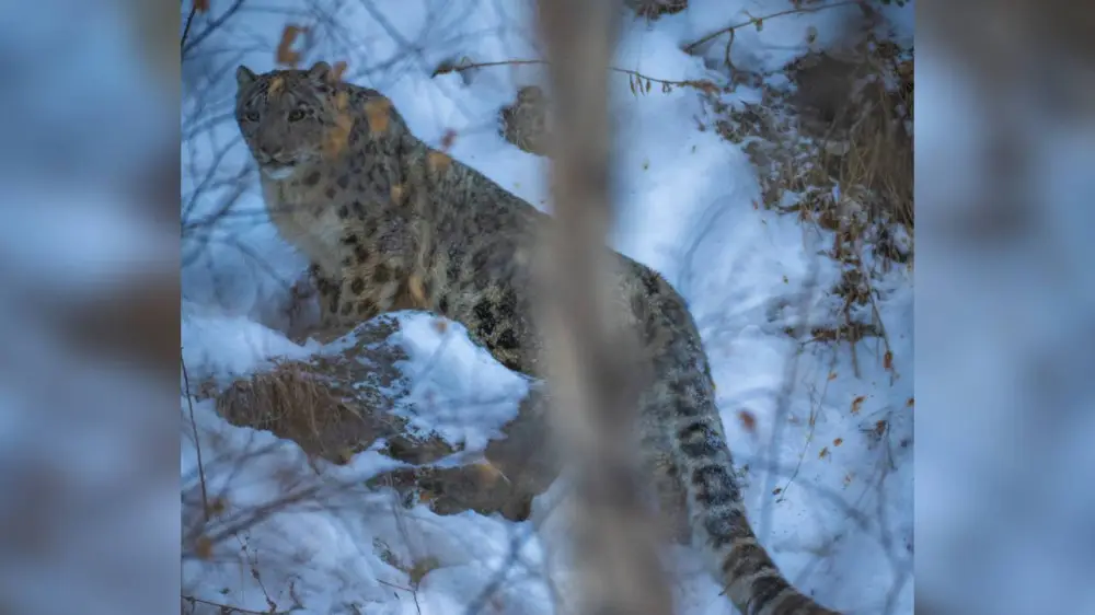 Автор редких кадров — предприниматель Анатолий Гаипов. По его словам, снежный барс оказался совсем рядом — примерно в 30–40 метрах.