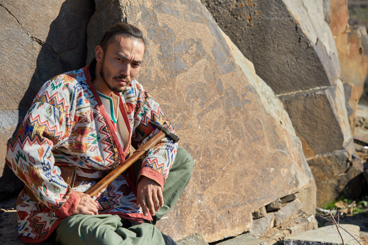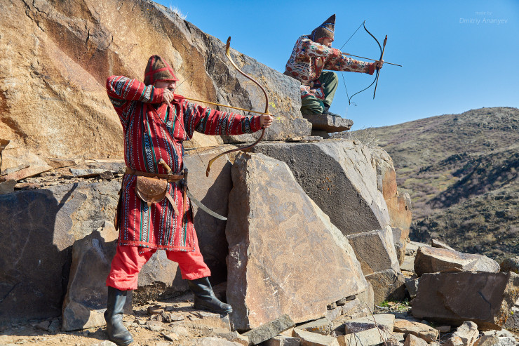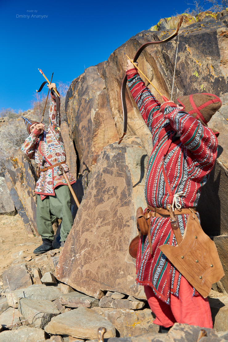 Во время экспедиции волонтеры провели импровизированную фотосессию и дали ей название "Между прошлым и будущим". На кадрах изображены модели в костюмах сакских воинов с репродукцией оружия тех времен на фоне петроглифов, которым тысячи лет.