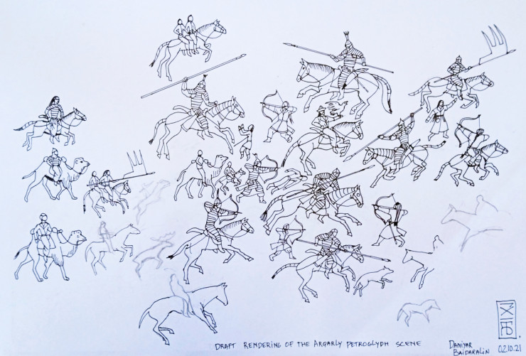 Петроглифы можно очень долго рассматривать и находить каждый раз новую картинку и сцену. Так, реконструктор Данияр Байдаралин попытался перенести изображения "Эпичной битвы" на бумагу.