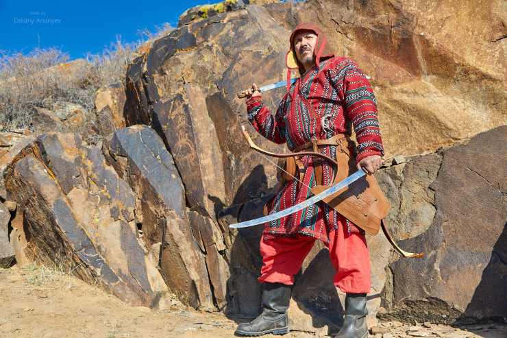 Костюм состоит из штанов, сапог, рубахи, куртки, колпака из войлока, поясные сумки из кожи. Все из максимально натуральных и грубых тканей. Оружие мы стараемся сделать безопасным, но при этом максимально приближенным весом и габаритами к оригиналу, чтобы все было реалистично. Плюс нам нужно понимать, как предки использовали его. Материал меча - черный металл. Лук и стрелы - из дерева и дакрона (полиэстеровая материя - прим. автора). Можно, конечно, использовать те же материалы и сделать в точности как предки, но цена будет намного выше", - объясняет Данияр.