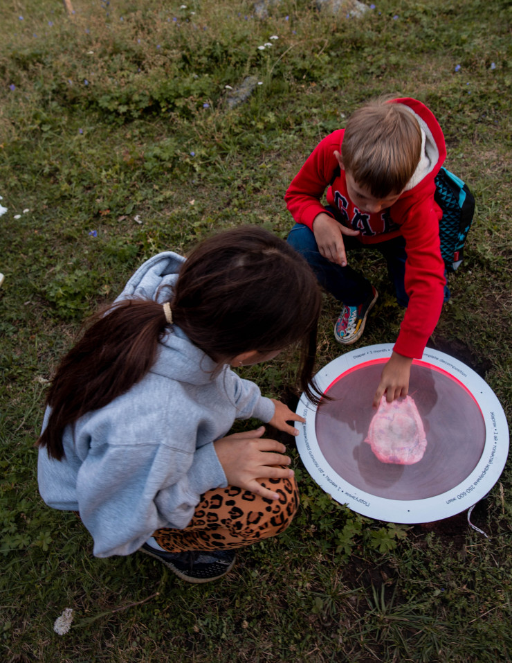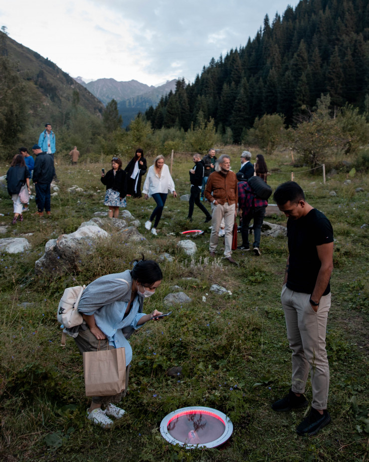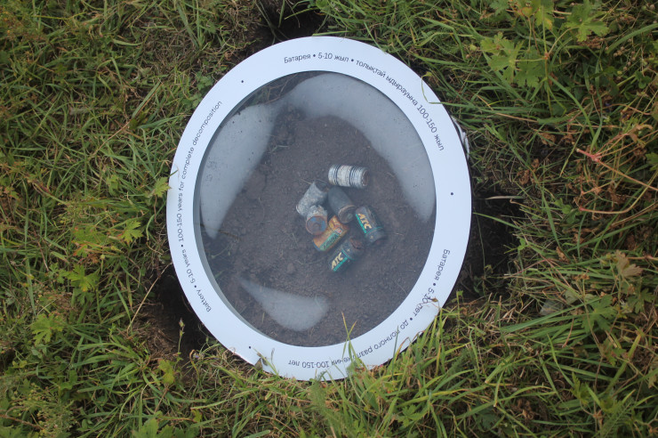 В чаши, установленные на земле, поместили мусор. Там, где могло отражаться голубое небо, лежат банки от напитков, упаковки еды, использованные памперсы и прочий мусор, найденный в окрестностях Аюсая.
