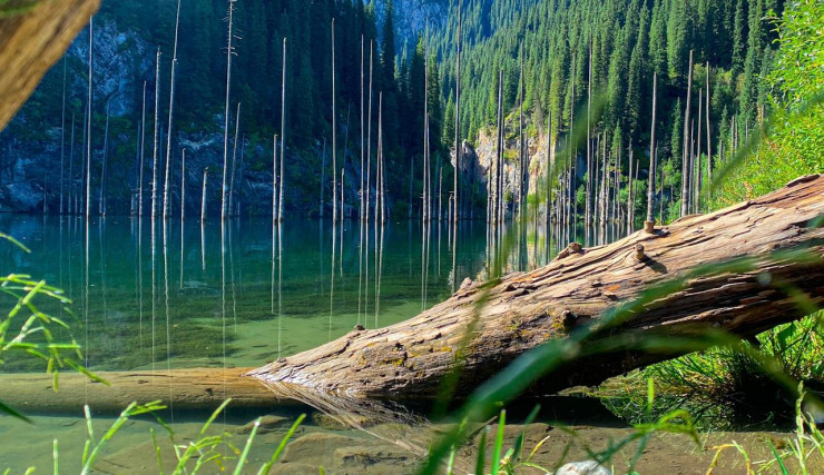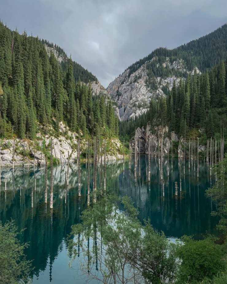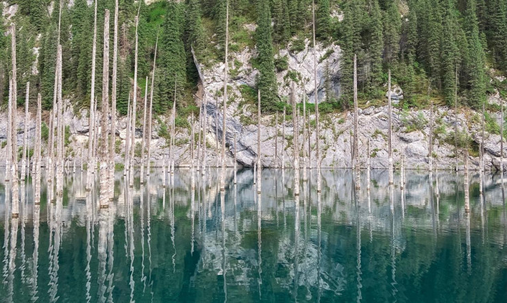 Озеро Каинды, расположенное в одном из ущелий Кунгей Алатау в Алматинской области Казахстана, остается популярным местом туризма даже несмотря на непростой способ туда добраться и низкую температуру воды. Озеро образовалось в результате Кеминского землетрясения в январе 1911 года, а в конце 1980-х его площадь уменьшилась после селевого паводка. Главная достопримечательность озера – ели, поднимающиеся прямо из воды, благодаря чему Каинды пользуется успехом у любителей дайвинга. Хотя имя водоему дали другие деревья - озеро назвали Каинды из-за большой березовой рощи, которая расположена в пяти километрах от него.