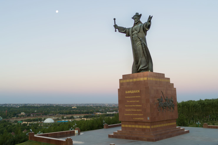 Недалеко от дендропарка раскинулось еще одно удивительное место - этноисторический комплекс "Казына" на Байдибек би. Он открылся 8 лет назад. Тем не менее парк очень интересный. Прежде всего привлекает внимание скульптурная композиция в его южной части: это самое высокое место, где возвышается постамент с 10-метровой скульптурой казахского бия Байдибека, весьма почитаемого среди казахов.