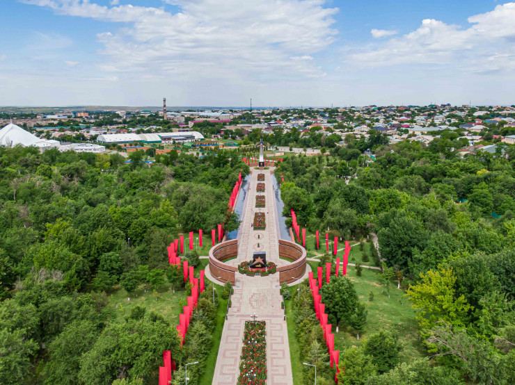 Центр парка пересекает удивительная Аллея Славы, которая начинается у подножия настоящего истребителя, установленного на постаменте. На гранитных монументах со словами "Никто не забыт, ничто не забыто" выгравированы имена 140 000 солдат - уроженцев юга Казахстана, которые воевали на полях Великой Отечественной войны (1941-1945 гг.). В конце аллеи установлена стела с вечным огнем, а рядом остановились танки и другая военная техника тех лет. Это не макеты, все в этом парке настоящее, подлинное. Как подлинны чувства потомков героев, отдавших свои жизни на полях кровавых сражений. Устроившись на мягкой зеленой траве, покрывающей газоны парка, можно посидеть в одиночестве, отдавшись воспоминаниям.
