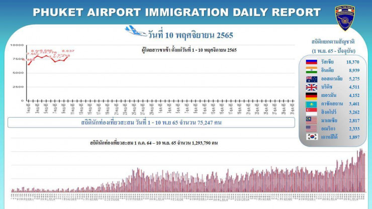 По данным отчета иммиграционной службы Пхукета, за 10 дней ноября из Казахстана на Пхукет прилетел 3461 человек. Из Германии - 4152, из Великобритании - 4511. Россияне находятся на первом месте по количеству прилетевших на остров в ноябре, 18 370 человек.